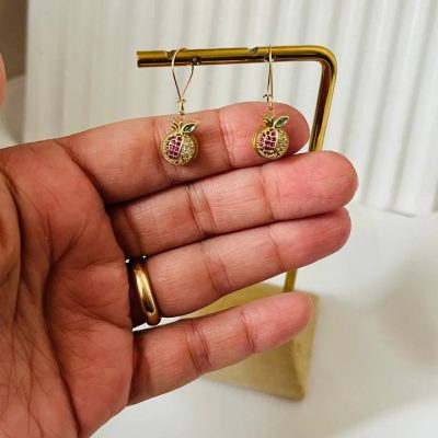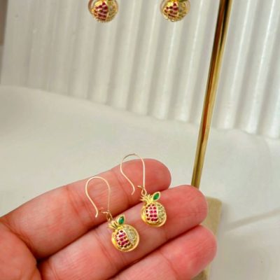 گوشواره طلا آویزی طرح انار یلدایی با نگینهای قرمز و سبز