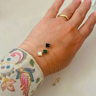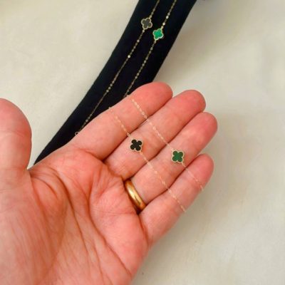 دستبند ونکلیف زنانه با طلای ۱۸ عیار، ۱۸سانت ،طراحی شبدر چهار برگ نماد خوش‌شانسی، وزن زیر یک گرم و مناسب هدیه،با مراقبت استفاده شود